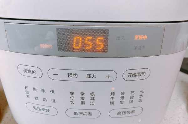 6、內膽放進電壓力鍋,選擇高壓燉煮,一般需要55分鐘,每個電壓力鍋不同,時間也會有差異,高壓燉煮好的豬蹄是軟爛的口感,想要筋道一些的,可以選擇中壓燉煮;