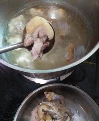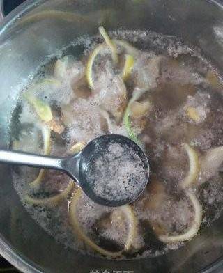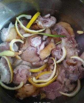 2、豬蹄放入鍋裡加檸檬皮薑蔥先煮去血沫。