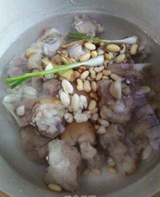 7、放入砂鍋裡加水加黃豆花生米蔥薑。