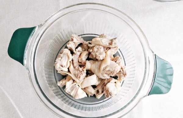1、把半隻雞切塊斬件,冷水下鍋加入薑片焯水,把雞塊裡的血水煮成血沫漂上來,就可以瞭,有料酒加一起去腥更佳。