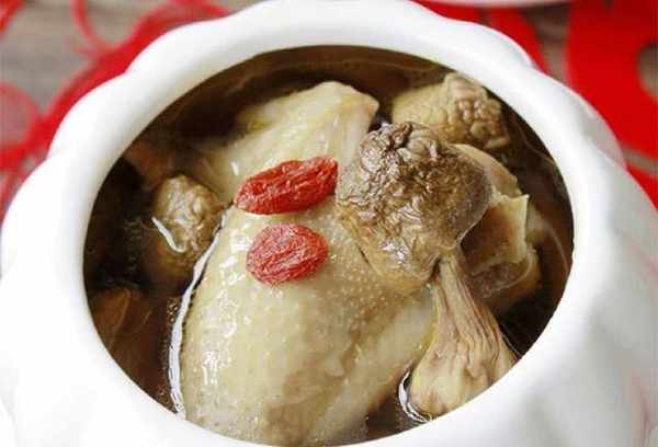 8、最後將雞、茶樹菇、薑片、枸杞和松茸一起倒入砂鍋裡,泡松茸的水也一起倒入,再加入適量的清水,水開後小火煲兩個小時即可。