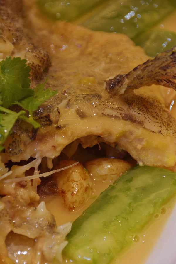 白汁黑毛節瓜燜細蘇鼠斑,蘇鼠斑肉身爽口,嫩滑鮮甜及帶濃厚魚味,黑毛節瓜與其一起燜制,吸飽瞭魚的鮮味,更顯得甜糯。
