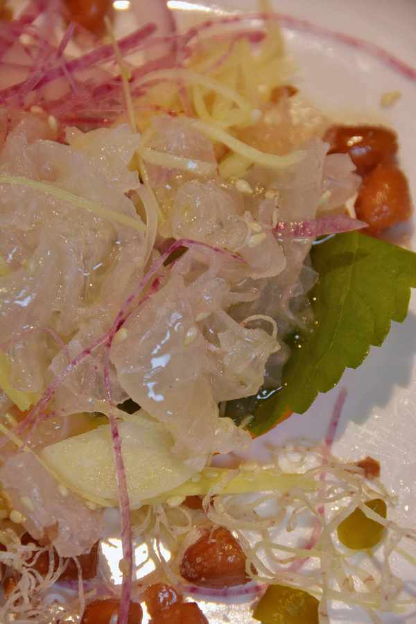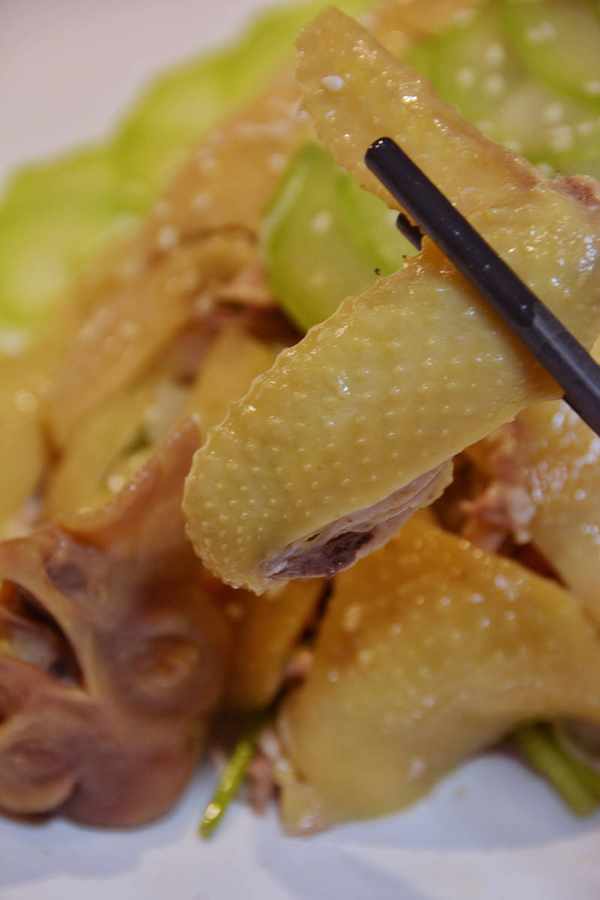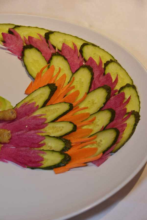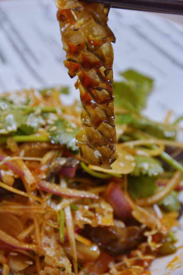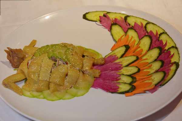 黑毛節瓜撈雞,桑麻黑毛節瓜再加入十幾道脆爽的香料,撈起清遠走地雞,寓意風生水起,更吸引眼球的是孔雀開屏般的擺盤。