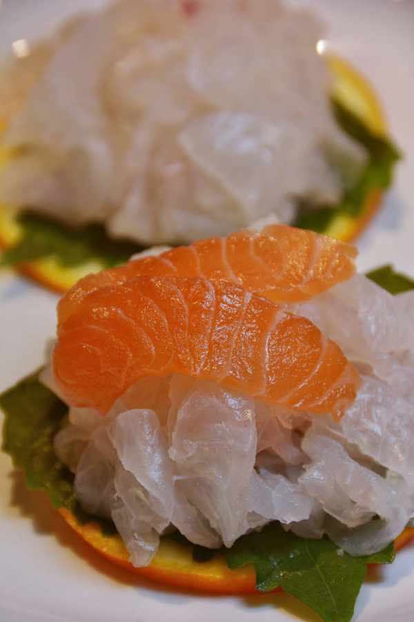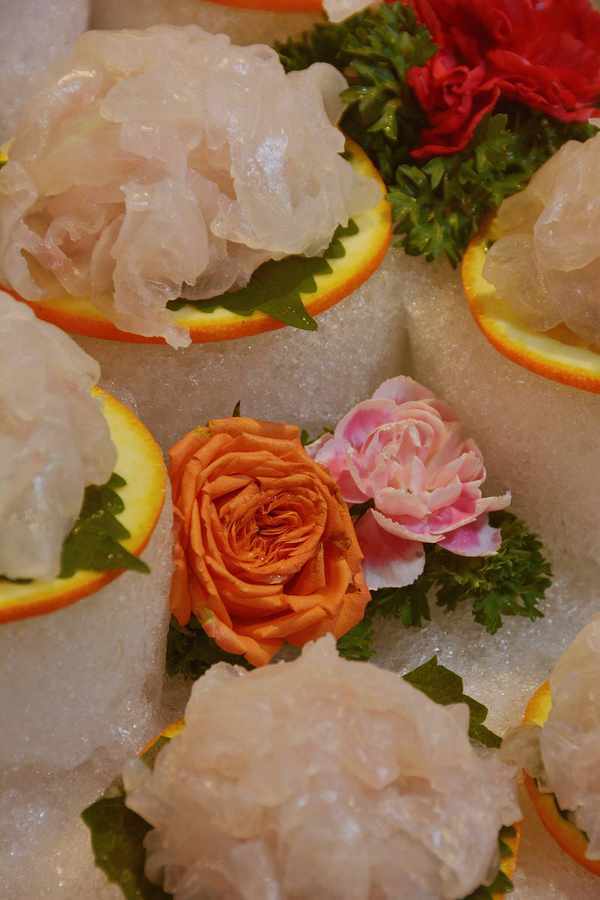 制作的鯇魚生薄如蟬翼,晶瑩剔透,擺盤也是很有講究,除瞭一小碗一小碗堆砌尤如菊花,更以三文魚貼成飛鳥的圖案,漂亮之至,而配料辣椒絲、洋蔥絲、紅蘿卜絲、檸檬葉絲等則以九宮格的盤子裝上,呈現出赤橙黃綠青藍紫色澤。