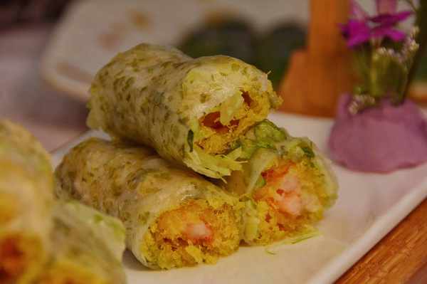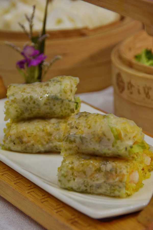 海苔金沙脆皮腸,也是一道顏值很高的點心,淡淡的青綠色,用海苔和米漿混合做成的外皮,裡面有蝦仁,吃起來口感層次豐富。