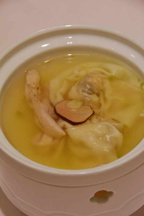 這個菜出乎意料的驚喜,普普通通的雲吞用黑松露作餡,以一個燉盅呈上,雞球濃湯加上黑松露片再度提香。