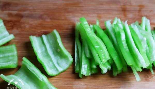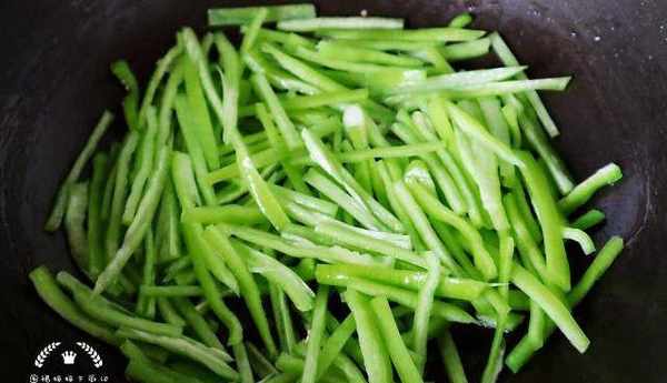 1、先把青椒清洗幹凈,去頭去尾,去籽去筋,先切成段,再切成絲備用。