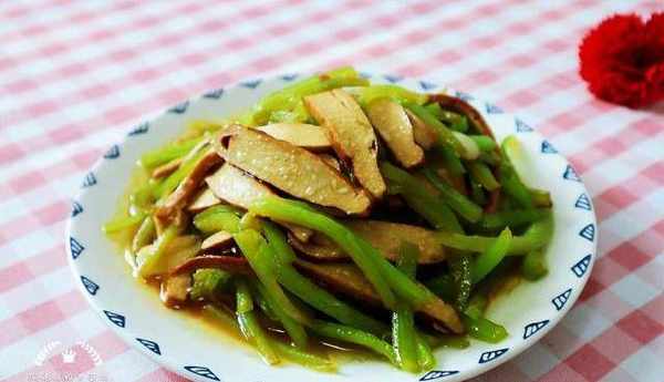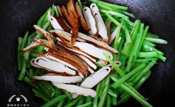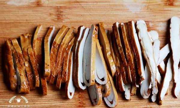 2、香幹清洗幹凈,切成細絲備用,寬度跟青椒絲差不多就可以瞭。