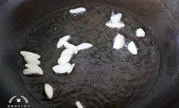 3、準備幾粒大蒜,剝皮後切片備用;炒鍋加熱,放入食用油,油熱後放入大蒜片爆香。