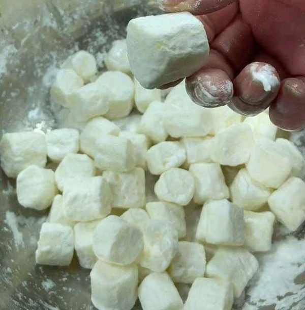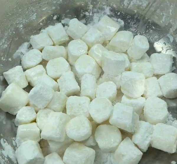 接著,加入一勺玉米淀粉,像滾元宵一樣把它攪拌均勻。然後,再給它稍微灑點水,這樣能夠使山藥裹得更加的均勻。