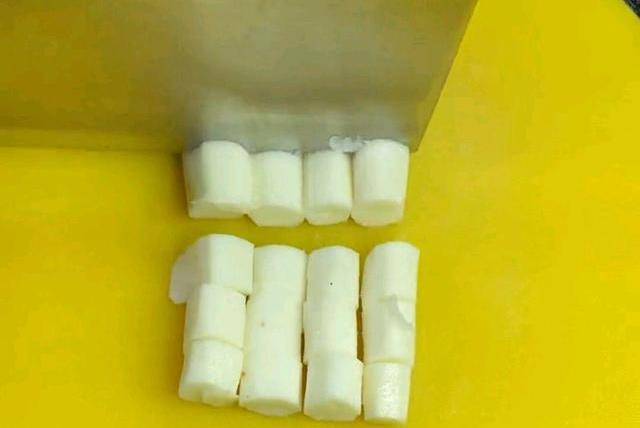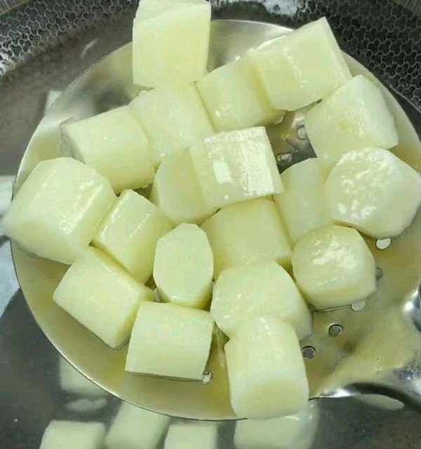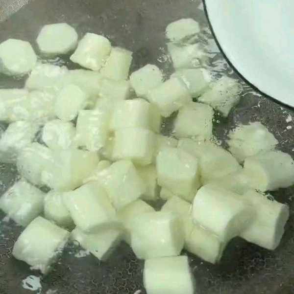 首先,準備山藥,去皮,切成小段,切好的山藥涼水下鍋燙一下,水開以後煮制一分鐘,撈出。然後,放到涼水裡面把它投涼,投涼以後撈出控幹水分,放入盆中。