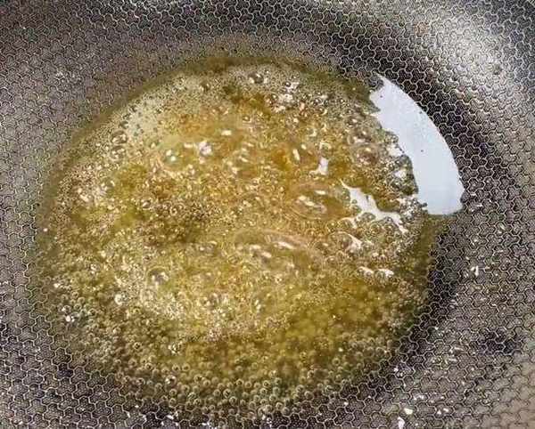 接下來,開始熬拔絲:鍋中放入一勺水,一大勺白糖,這個時候開小火慢熬,將白糖從大炮熬成密集的小泡,熬成香油色,糖漿就算熬好瞭。