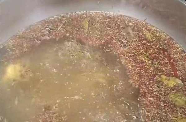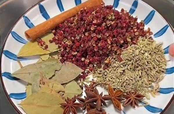 今天我用八斤水和800克鹽做講解,將水和鹽全部倒進鍋中,再加入花椒粒、小茴香、八角、香葉和桂皮,用勺子把水攪拌一下,讓鍋裡面的鹽充分的融化,化開後,開大火將水燒開,之後再轉小火煮五分鐘,充分把裡面的大料熬出香味,熬好後放涼備用。