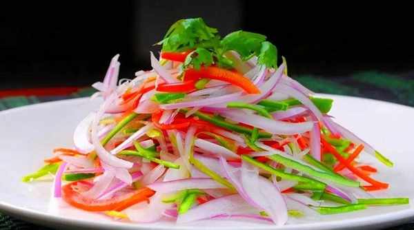 1. 將萵筍、洋蔥、青椒、紅椒均洗凈切成細絲,用鹽醃漬入味。