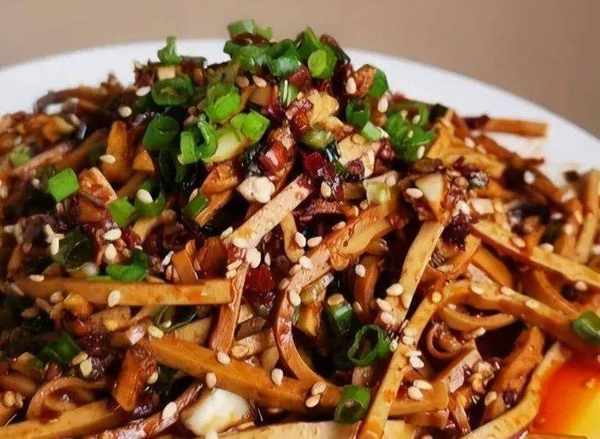 2.拌菜:盆加鹽少許,味精,雞精少許,一品鮮醬油,蒜米,香油,醋少許,白糖,香菜段,花生,香幹拌勻即可。