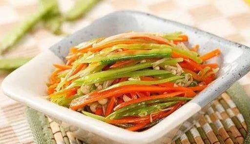 材料:鮮荷蘭豆、胡蘿卜、金針菇、蒜末、醋、味精、鹽、香油。