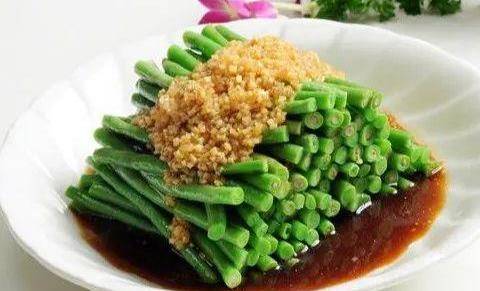 2. 鍋中放水燒開,放入豇豆段煮熟,撈出,瀝幹,放於盤中。