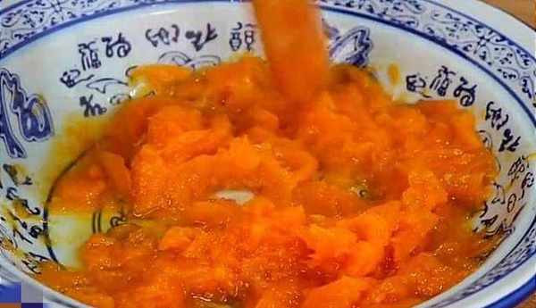 20分鐘過後,關火,把南瓜取出來倒入碗中,用搟面杖把蒸熟的南瓜搗成泥(我這裡用到的是200克的南瓜),加入10克白糖,把它攪拌均勻。