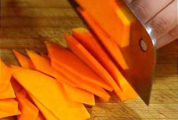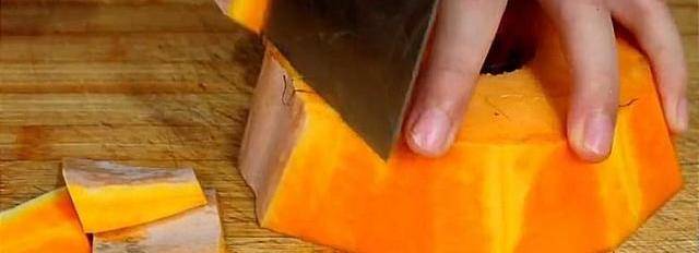 首先,準備一塊南瓜,將南瓜給它去皮,去完皮之後的南瓜先切成小塊,再切成薄片。全部切完放入盤中,冷水上蒸鍋,開大火蒸20分鐘。