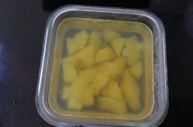 菠蘿凍切成小塊再放冰箱待用