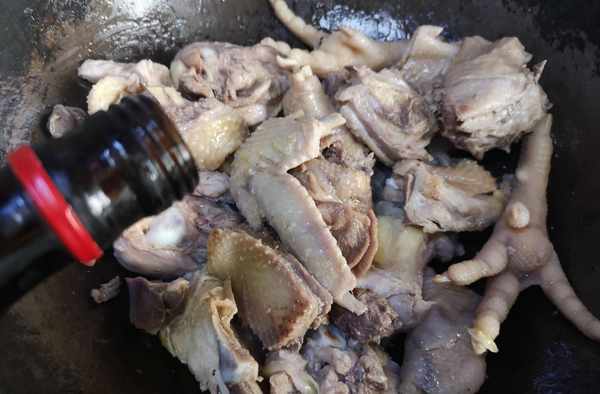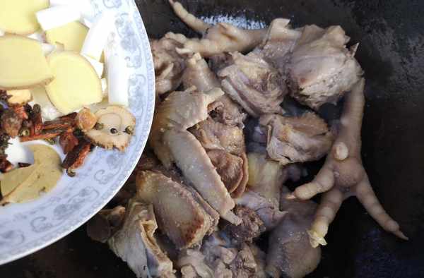 鐵鍋中放入少許花生油,將雞肉中的油脂剔出來,放入鍋中小火將雞油煸出來。接著將焯好水的雞肉塊放入鍋中,大火翻炒出水氣,淋入一大勺料酒。