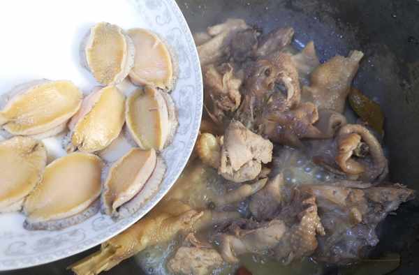 大火燒開之後轉小火慢燉四十分鐘左右。最後放入鮑魚,繼續小火燉煮5分鐘左右。