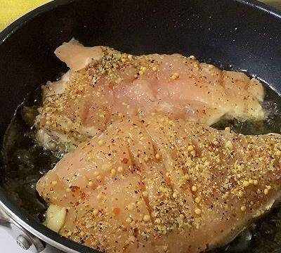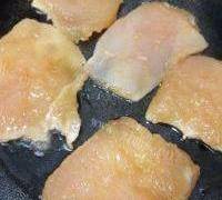 挑幹凈以後把醃制好的雞胸肉放入鍋裡面,一次不要放太多,開中小火慢慢煎至,大概需要煎三分鐘左右,先把一面煎至金黃,三分鐘以後把雞胸肉翻一下面,翻面以後再煎三分鐘,把兩面都煎至金黃,然後把它撈出來備用。