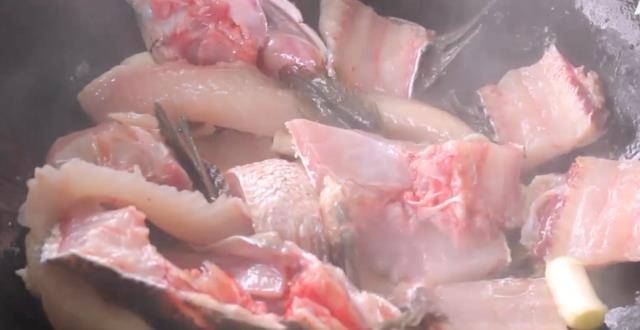 4、鍋燒熱加適量的油,把油燒至微微冒煙然後把油倒出去(潤鍋,等會煎魚不粘鍋)。然後重新加入適量的油(最好用豬油),下入蔥段和薑片,然後下入醃好的魚骨,把魚骨煎至兩面金黃(煎一下熬出來的湯更白更濃)。