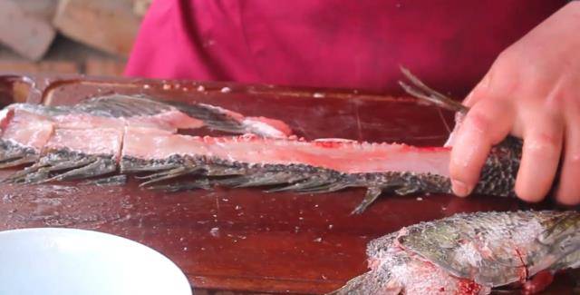 步驟:1、黑魚蔥尾部開刀順著魚排骨把魚肉切下來,然後砍下魚頭,然後把魚骨均勻砍成段。