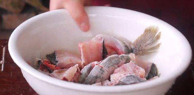 2、切好的魚骨多放一點鹽,加一點料酒或者啤酒,然後加水用力清洗幾次(把淤血洗幹凈)。洗好的魚骨加入適量的鹽(3斤魚大約加入一調料勺的鹽)、一點料酒,拌勻醃制幾分鐘。