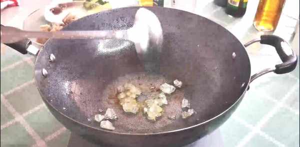3.鍋裡倒少許油,放入冰糖,轉小火,開始炒糖色,中間不斷攪拌,直到冰糖融化、起泡、變成棗紅色