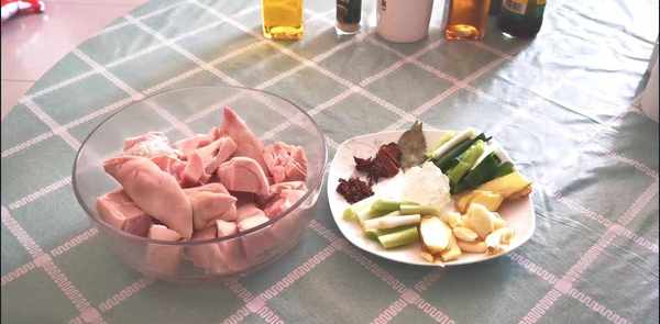 1.首先,準備洗凈切塊的豬蹄,蔥段、薑片、蒜瓣、八角、桂皮、花椒、香葉和冰糖