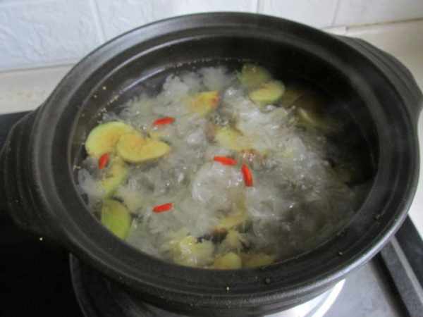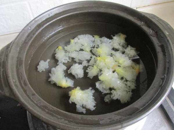 砂鍋裏放入清水,倒入銀耳大火燒開,改成小火慢慢的熬制大約30分鐘。