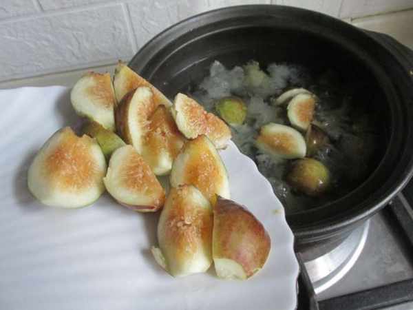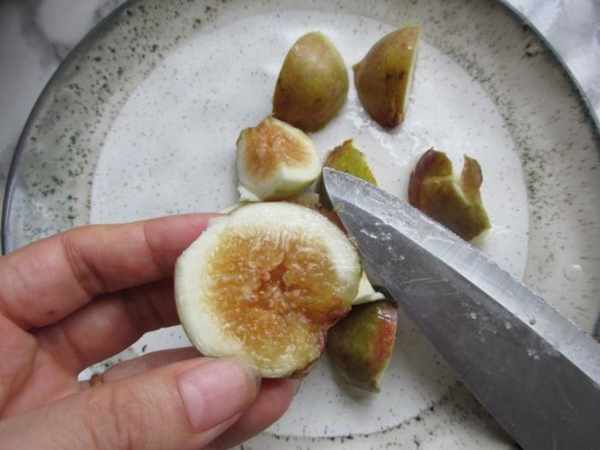 無花果熟透以後,軟軟的,我們洗淨無花果,用到去掉蒂,切成塊狀備用。
