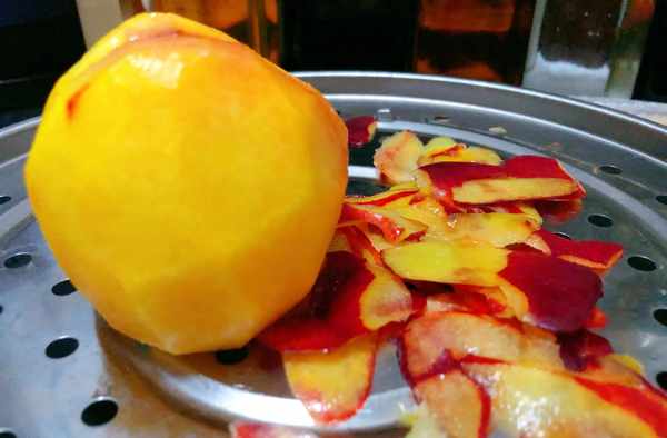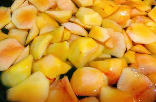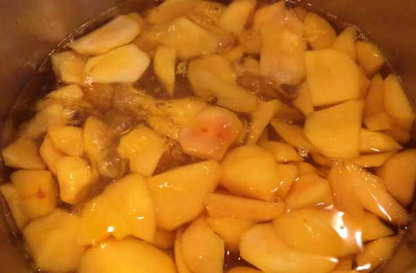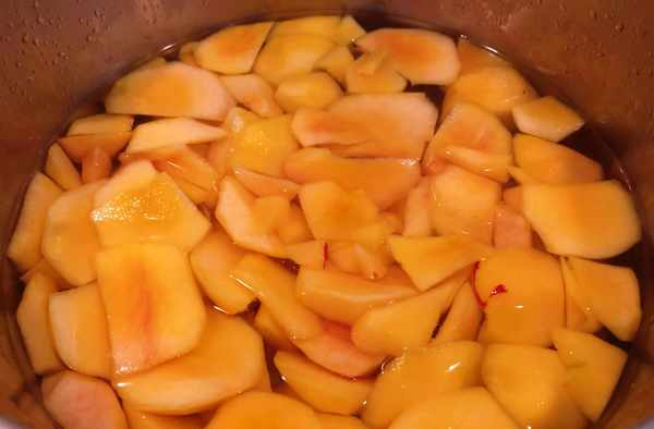 鍋中倒入適量的水,水開倒入控幹的油桃塊。煮15分鐘後,用筷子試試油桃罐頭是否燉熟。然後,加入適合自己口味的適量冰糖。