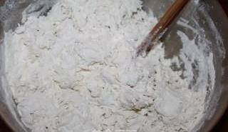 2、將溫水緩緩倒入面粉中,邊到邊攪拌至面粉呈棉絮狀。