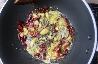 4、冷鍋倒油,油熱後倒入配料炒香。