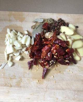 2、大蒜,生薑,幹辣椒,八角,香葉,花椒洗凈切好備用。