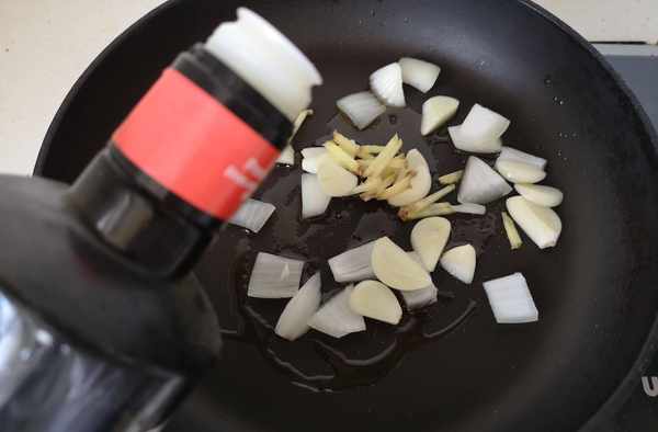 4、鍋中放入適量的橄欖油,薑蒜片,薑絲和黃圓蔥平鋪在平底鍋中。大蒜和黃圓蔥的用量盡量多一些,最好能鋪滿整個鍋底。