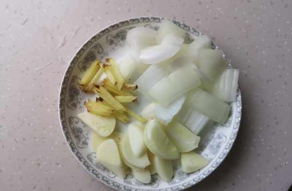 2、半顆黃圓蔥切成小塊,大蒜切成片,生薑切成絲,紅辣椒切成小丁,蔥切成蔥花備用。