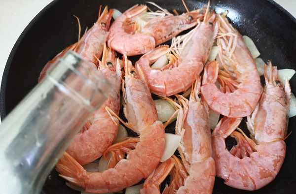 準備食材:阿根廷紅蝦8個,黃圓蔥半顆,大蒜5粒,生薑2片,米酒一大勺,生抽一勺,黑胡椒碎適量,橄欖油適量