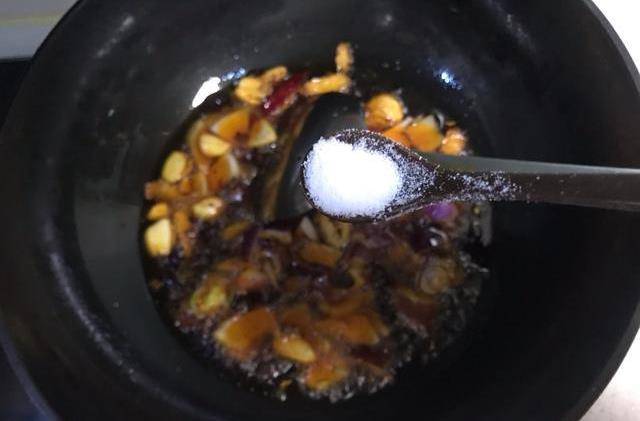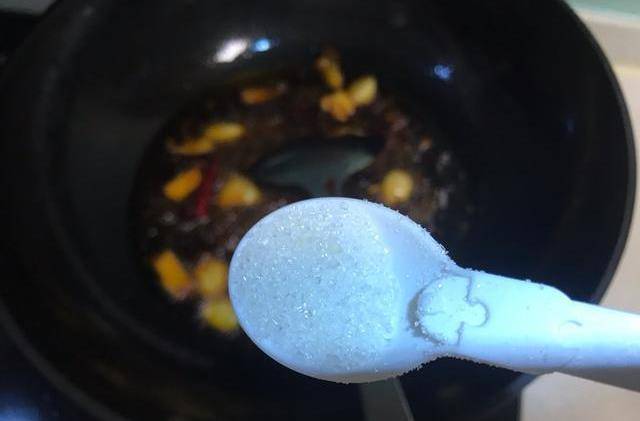 加入1小勺白糖,繼續翻炒30秒