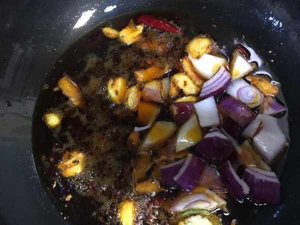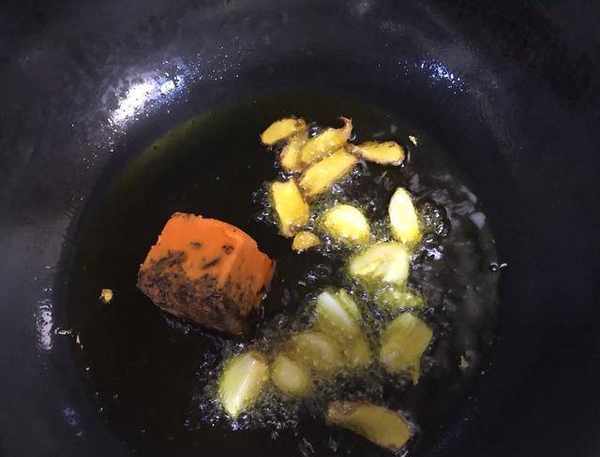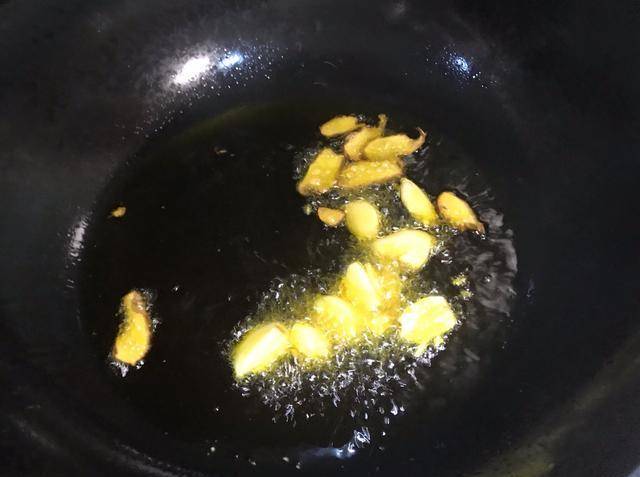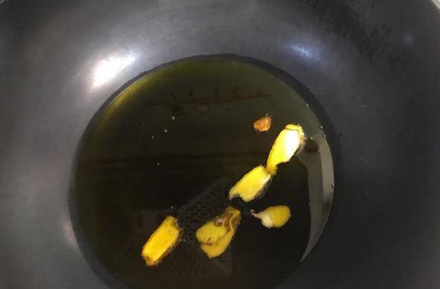 油熱透後關火,待油溫稍降低後下老薑片,開小火