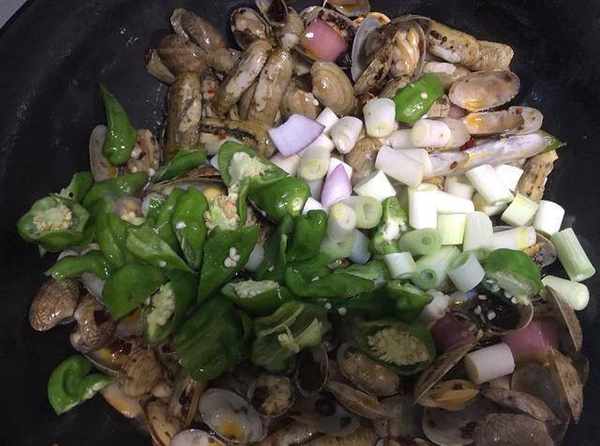 加入青辣椒和大蔥段,繼續翻炒30秒