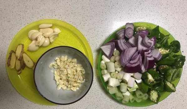 洋蔥青辣椒切塊,大蔥切段,老薑切片,大蒜一半切末