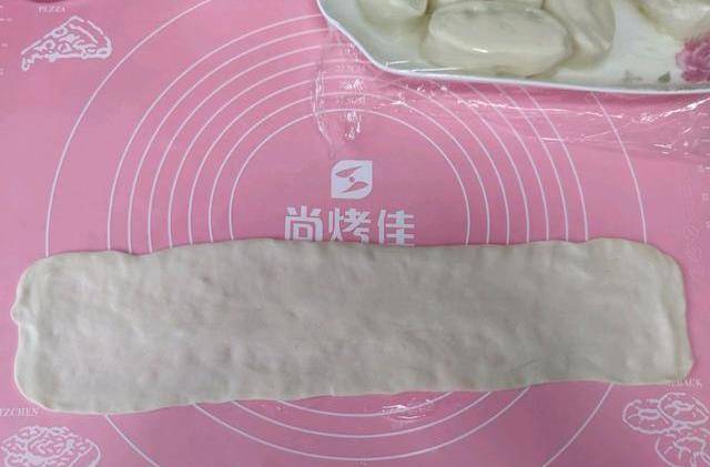 面醒好後,不用搟,直接拿手推開成長方形大片,此時面的延展性特別好,輕輕推開就可以