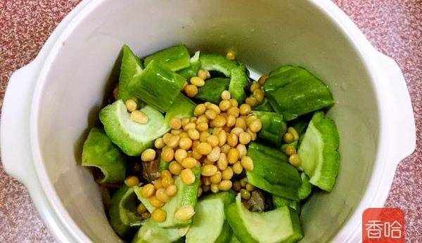4.把豬骨、苦瓜、黃豆放入燉盅裡
