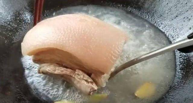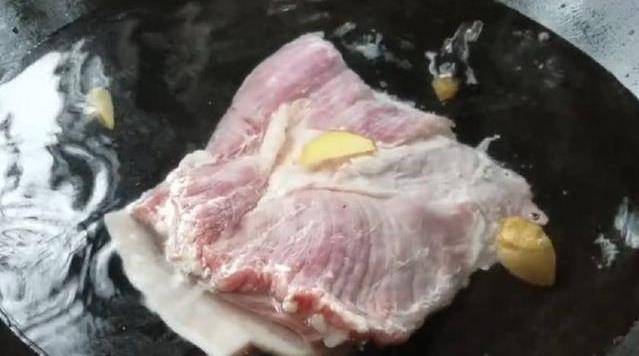 1.鍋中倒入足量的清水,將五花肉整塊下入鍋中,下入幾片薑片焯熟。