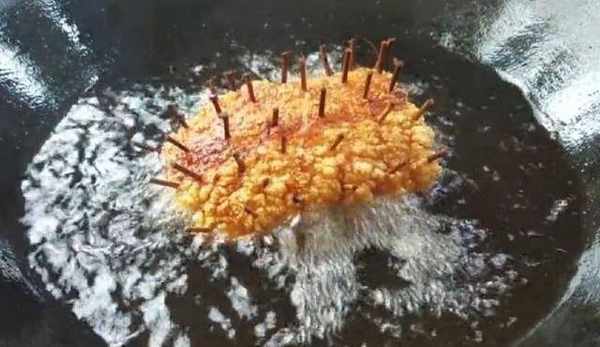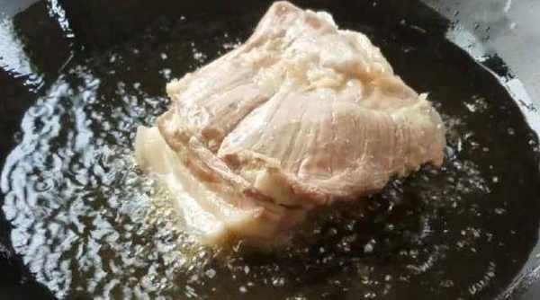 7.蓋上蓋子,用小火慢炸1小時,將肉皮炸到這樣就可以翻一面炸香。