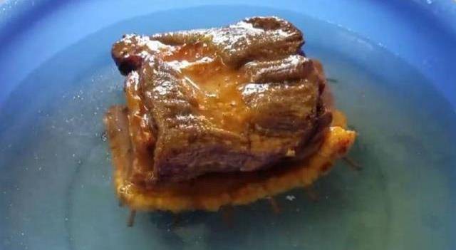 9.將炸好的五花肉放入冷水中泡發,如果不是馬上吃,可以放入冰箱等到想吃的時候再泡發。